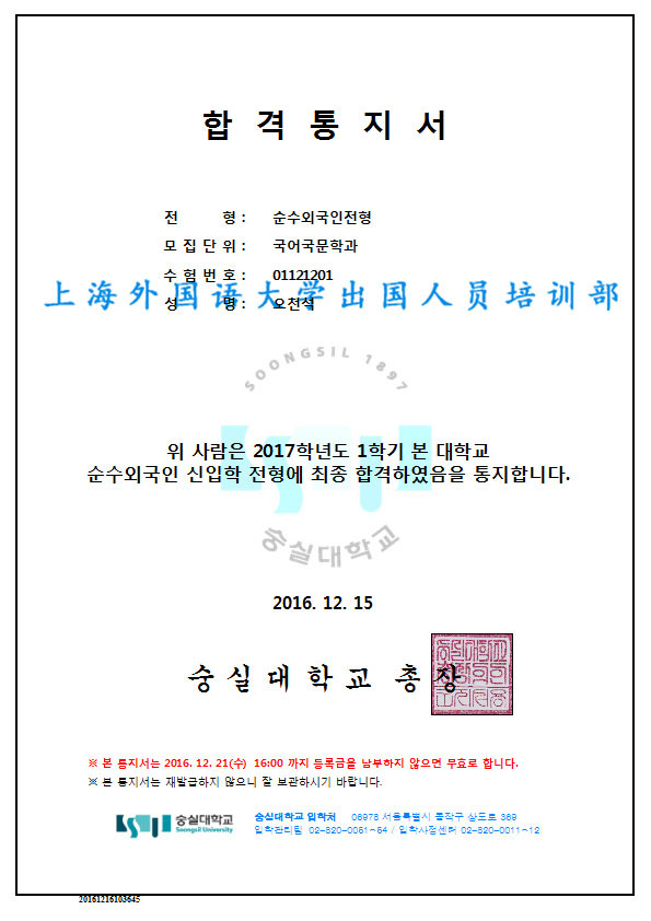 赵同学被崇实大学国际通商专业录取