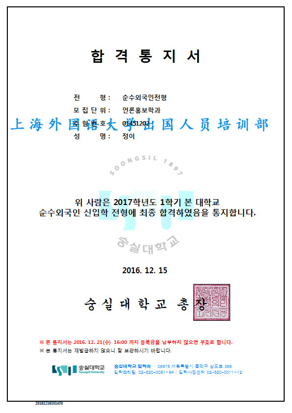 马同学被崇实大学经济通商专业录取