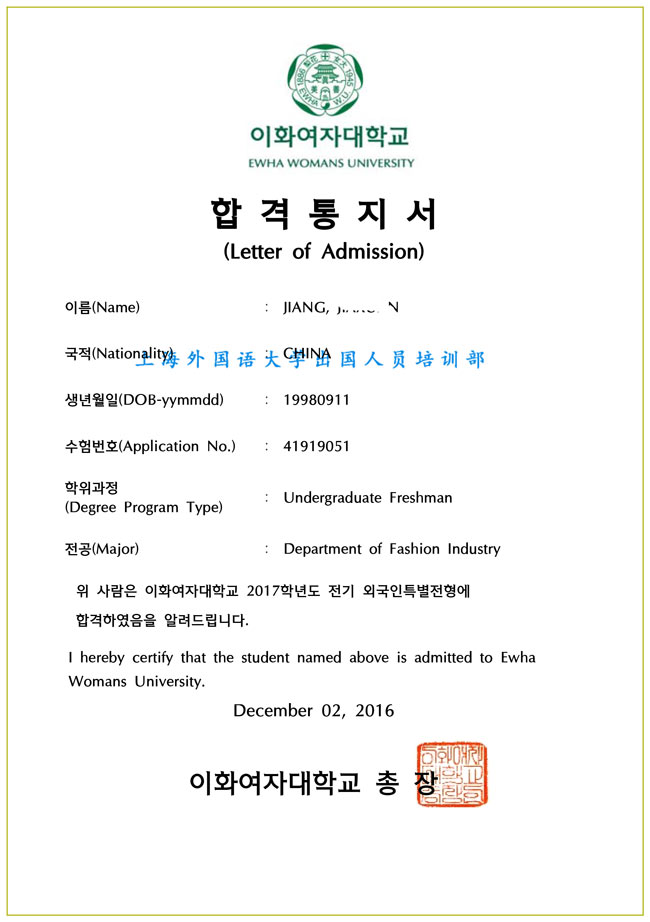 江同学,女,浙江温岭人, 高三,参加上海外国语大学出国人员培训部韩语留学项目的学习,取得TOPIK3级成绩,录取院校:梨花女子大学服装产业专业。