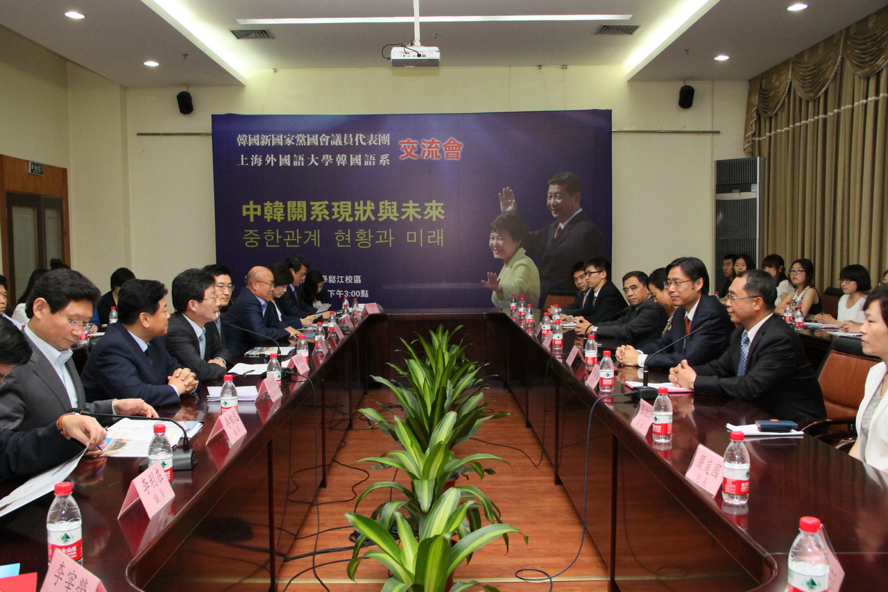 6月20日,以国会议员、新国家党前最高委员刘承旼为团长,新国家党第一事务副总长、国会议员金世渊为副团长的韩国新国家党国会议员代表团一行9人访问上海外国语大学松江校区。校党委书记姜锋会见了代表团成员和陪同来访的韩国驻上海总领事具相灿。