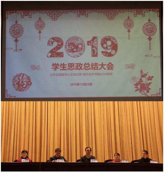 上海外国语大学出国培训部、海外合作学院于12月20日在松江校区教育会堂召开2018—2019年度学生思政总结大会。副校长张峰、学院党政班子及优秀教师代表等出席会议,大会由学院总支书记张缅主持。