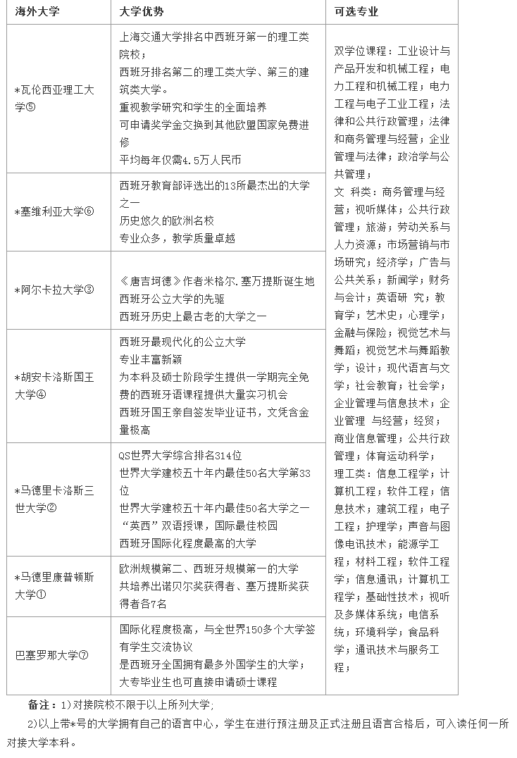 对接院校广泛:学生在通过该西班牙预备课程后,可升入包括马德里康普顿斯大学、马德里卡洛斯三世大学、瓦伦西亚理工大学、塞维利亚大学、阿尔卡拉大学、巴塞罗那自治大学在内的西班牙所有大学深造学习。